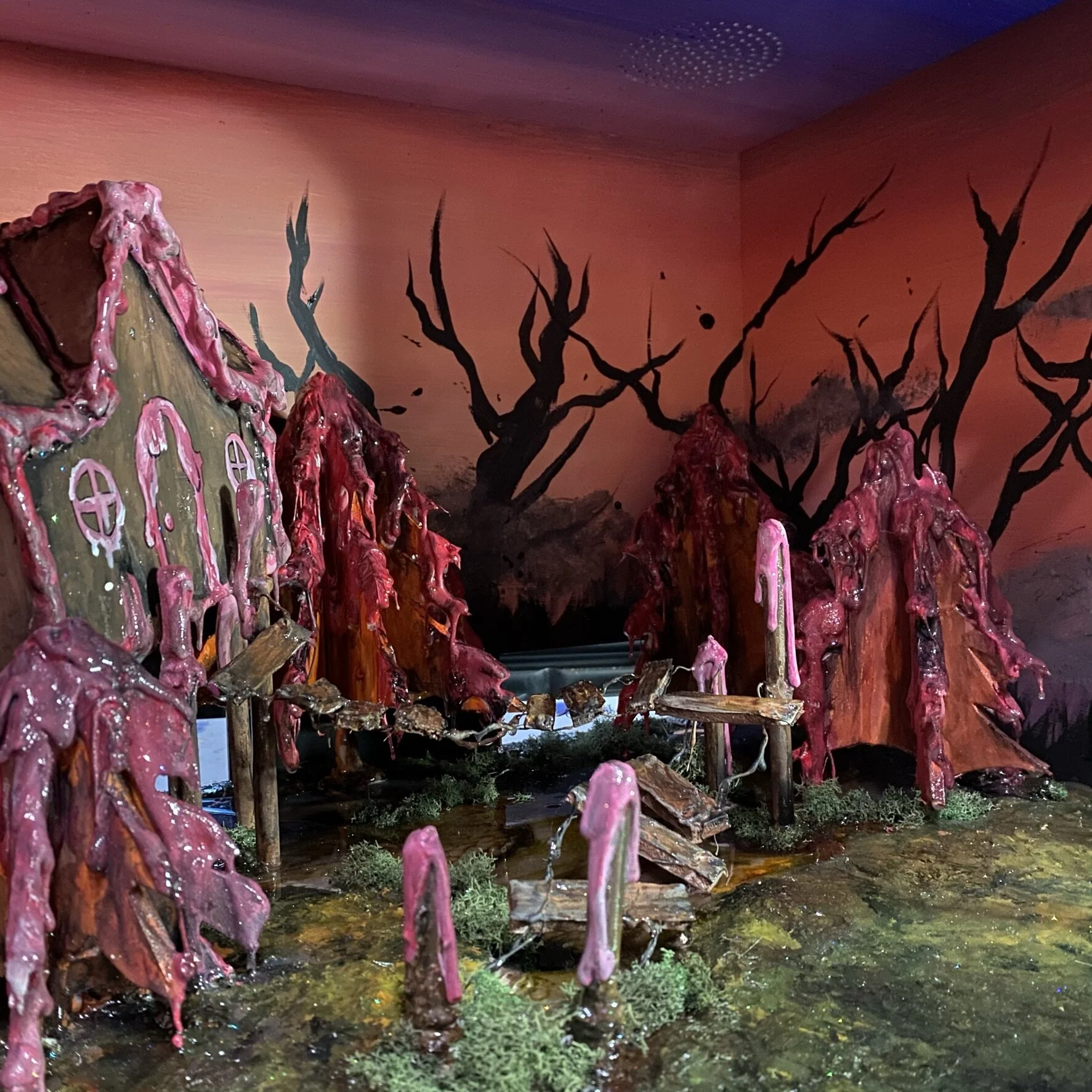 Sam Huff’s experience in larger-than-life scenic art is transferable to the smaller scale. She utilizes her finely honed bag of tricks to create intricately detailed and whimsically crafted environments packed with character and charm.